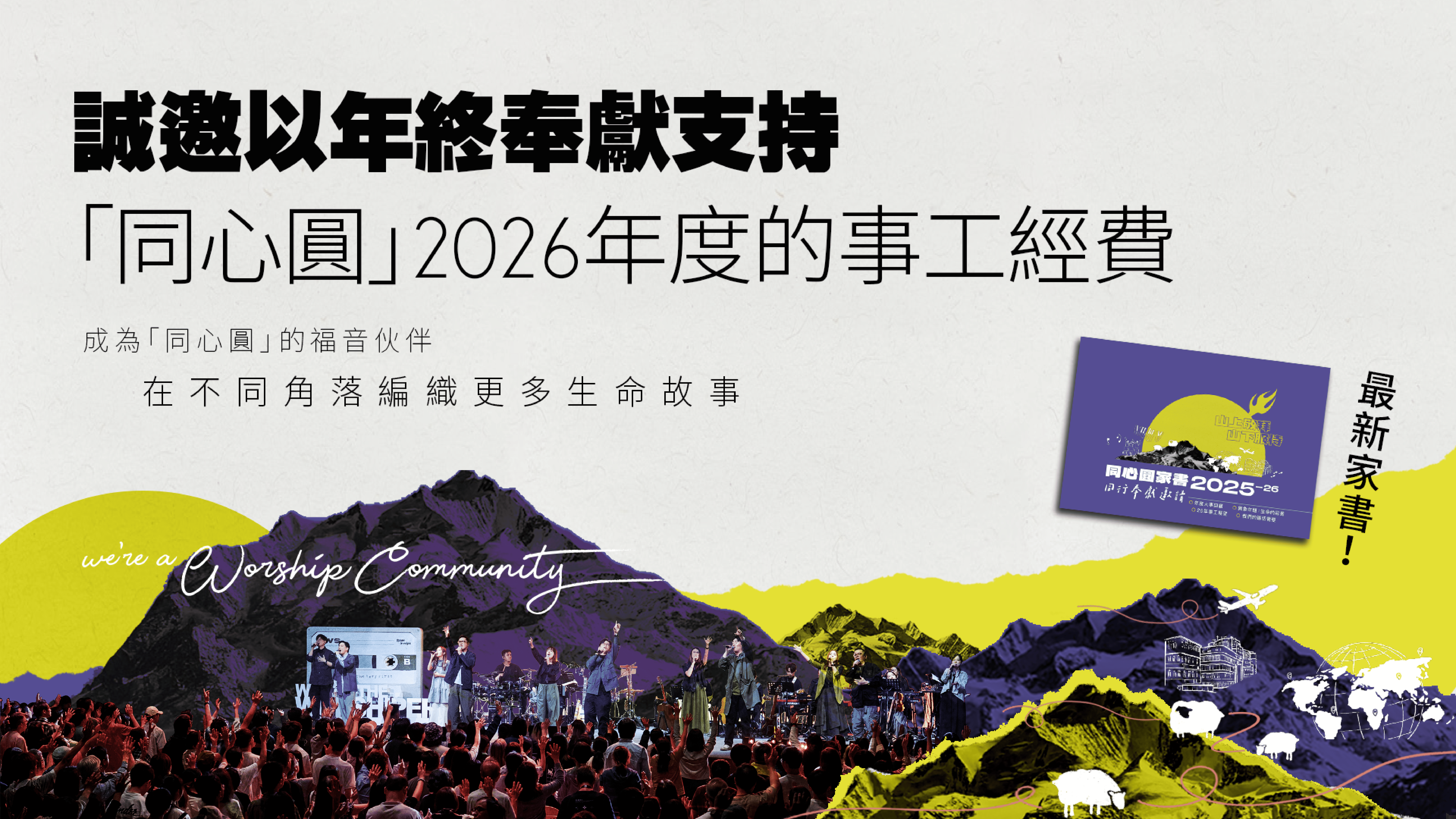今年我們會繼續堅守「山上敬拜、山下服侍」的異象,在末世裡藉著同行的服侍,讓更多人與神建立真誠敬拜的關係,叫在黑暗絕望中的人能堅持美善,定睛於神,昂首前行。展望2026年,我們仍需籌募850萬,以繼續維持並推動生命敬拜與關懷的工作!
